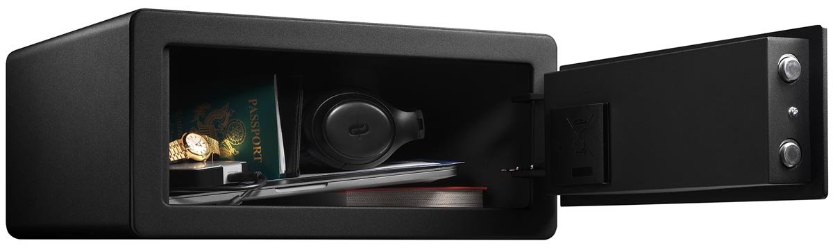 Cofre biométrico compacto e moderno com acesso por impressão digital, ideal para proteger documentos, joias e eletrônicos com segurança reforçada e praticidade.