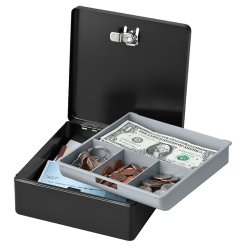 Cofre compacto e funcional com gaveta removível e chaveiros, ideal para guardar dinheiro, moedas e recibos com segurança em ambientes domésticos ou empresariais.