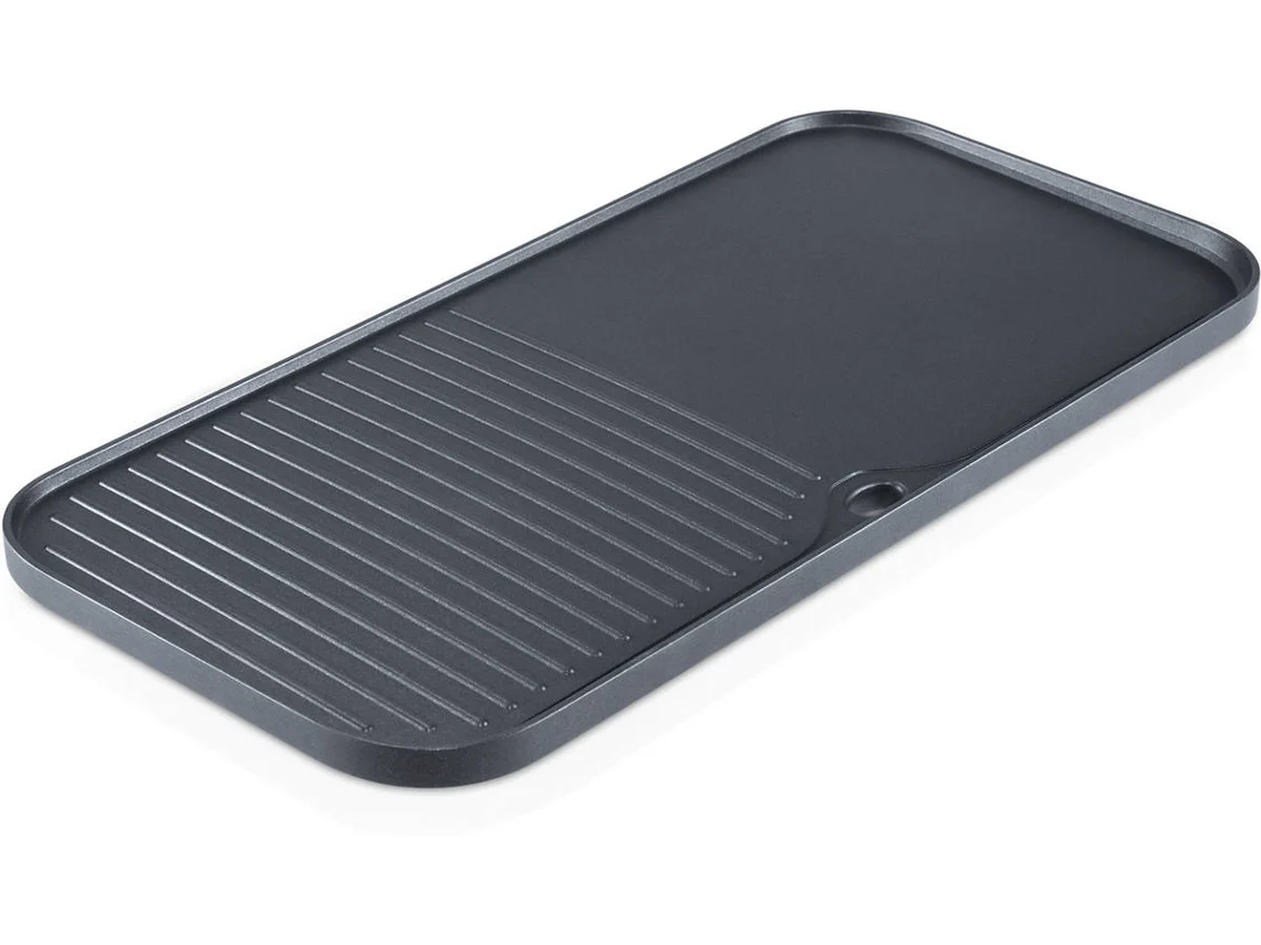 Este grelhador destaca-se pela versatilidade do sistema Duo, que permite utilizá-lo tanto fechado como aberto a 180°, funcionando como chapa dupla. As placas antiaderentes facilitam a limpeza e garantem uma cozedura uniforme sem necessidade de adicionar gordura.