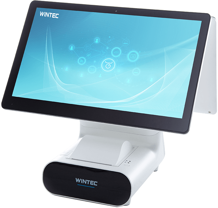 POS WINTEC AnyPOS80 com tela dupla de 15.6”, impressora térmica, leitor MSR e conectividade completa. Ideal para varejo moderno.